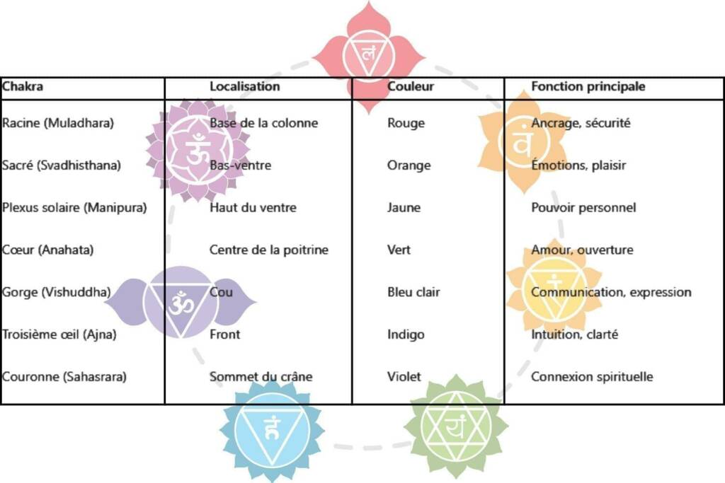 Chacun d’eux est associé à une zone du corps, à une couleur, à une fonction symbolique, et à une fréquence énergétique spécifique.